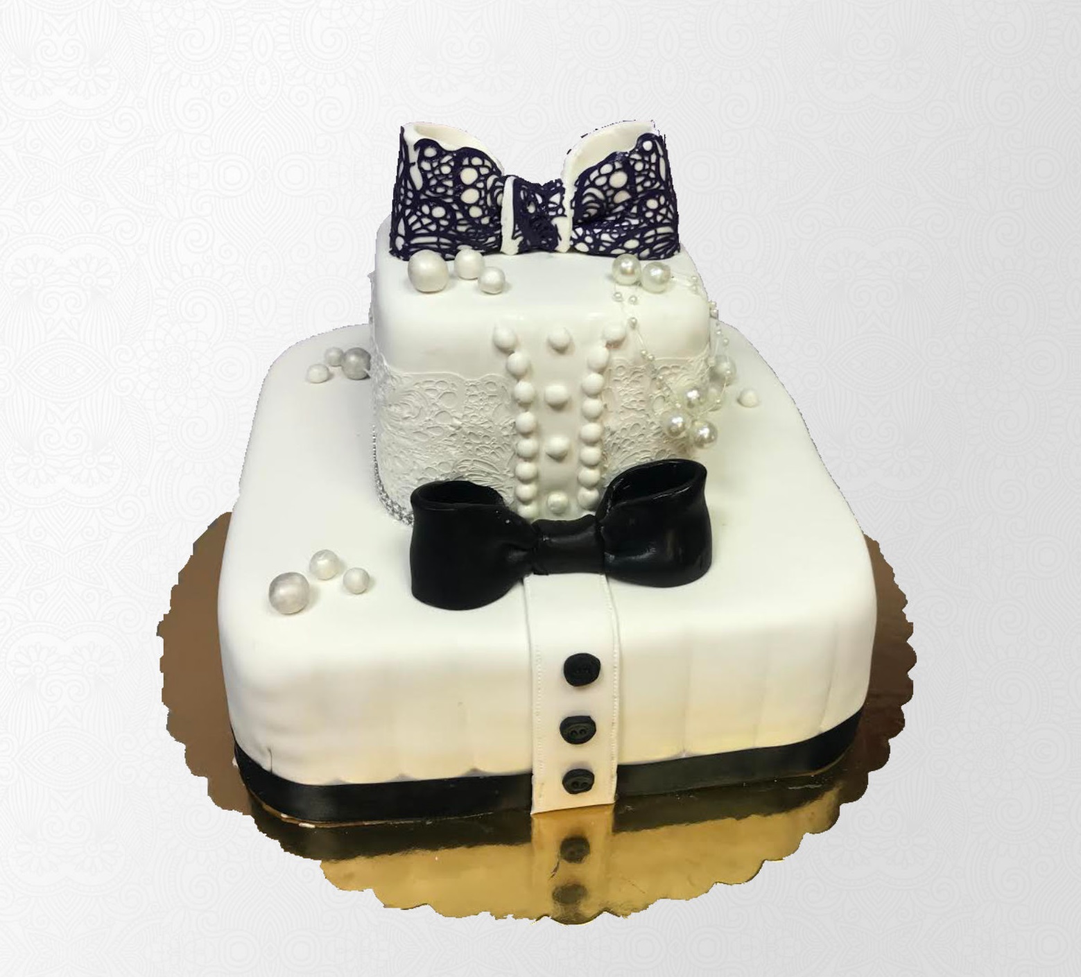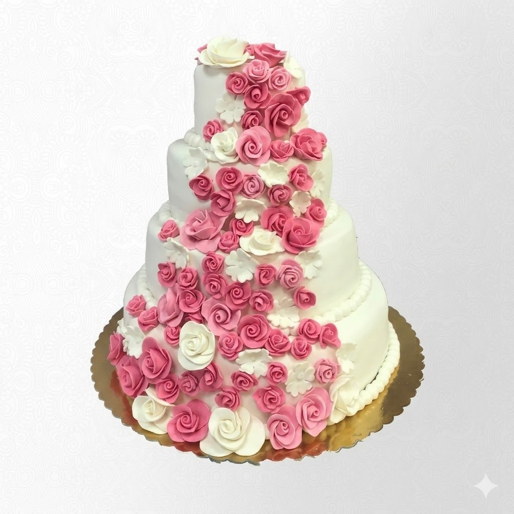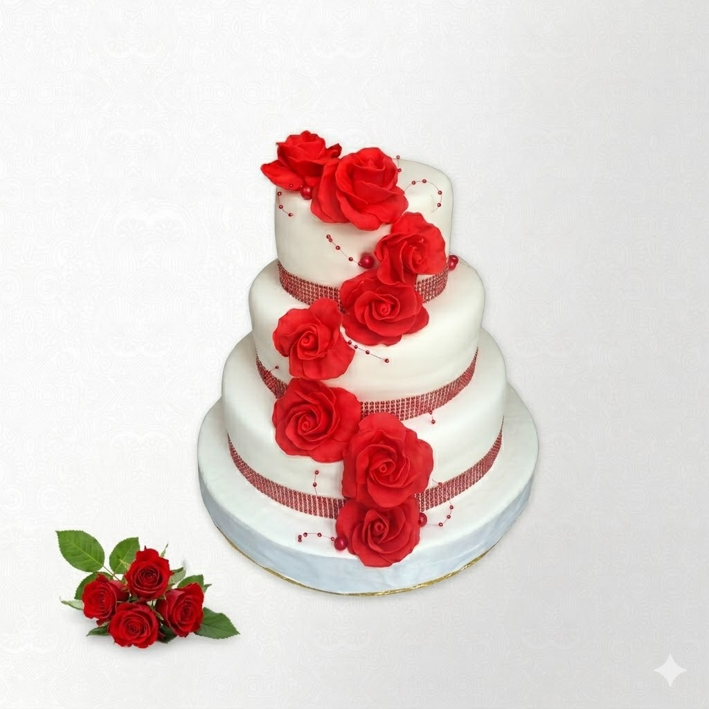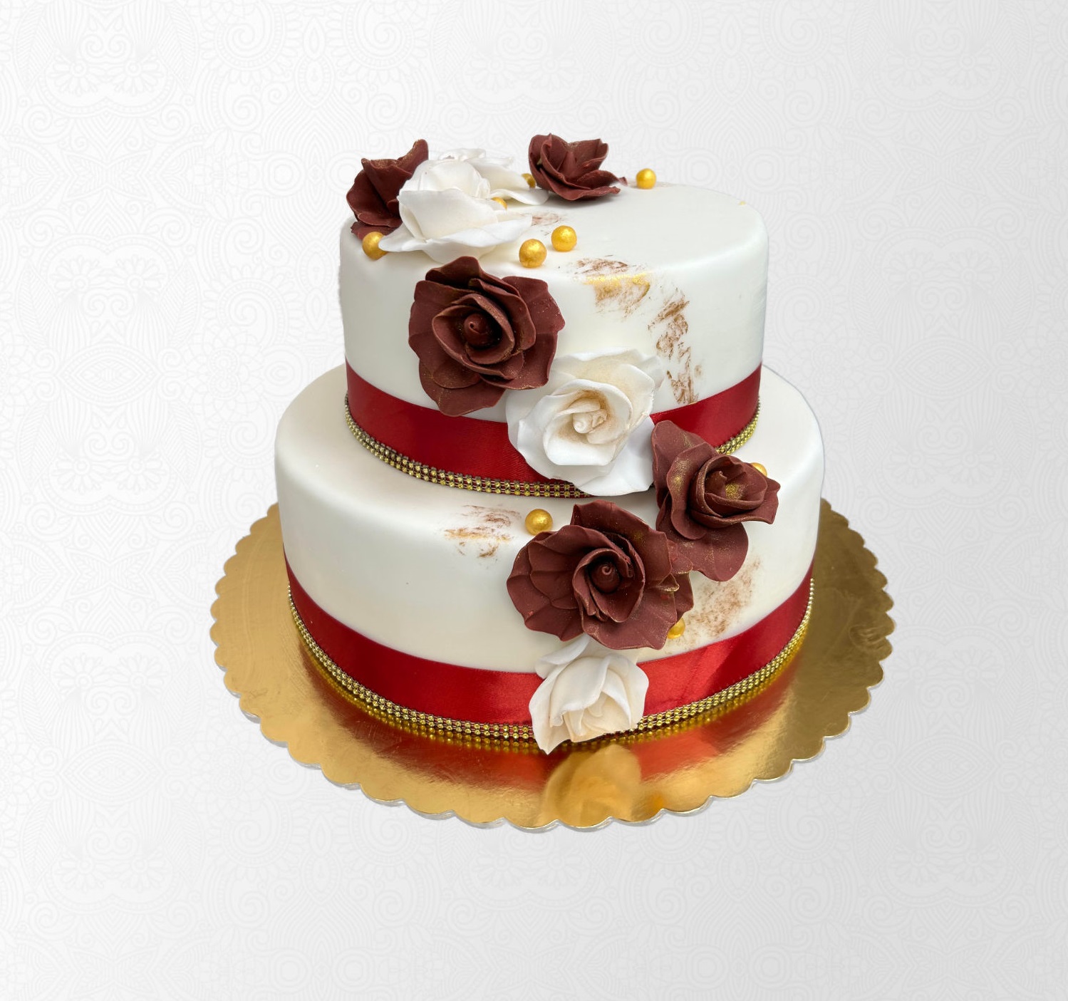 imbracat in frisca; se adauga pretul figurinei necomestibile; pentru greutati mai mici se adauga si pretul trandafirilor din icing (pasta de zahar)
