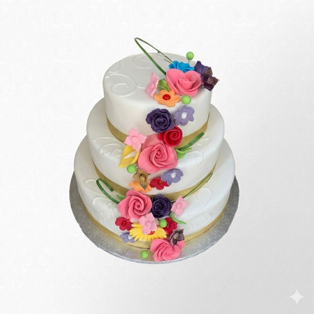 imbracat in icing (pasta de zahar); florile sunt realizate manual din icing; decorul contine si elemente necomestibile