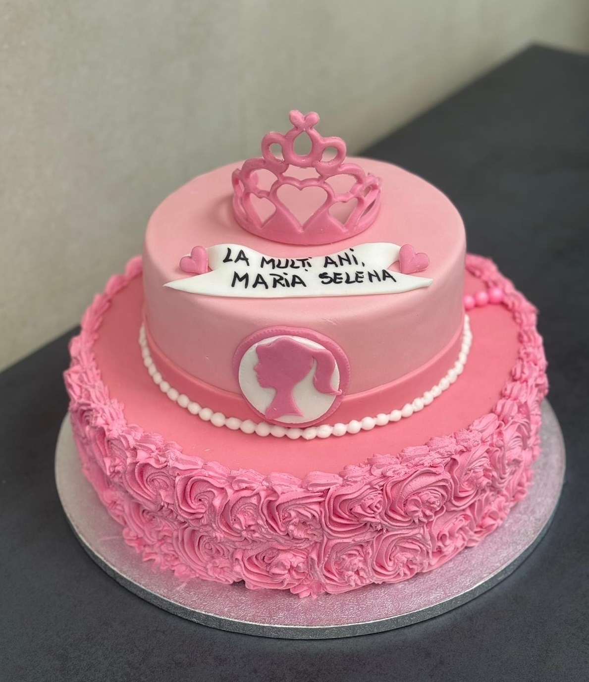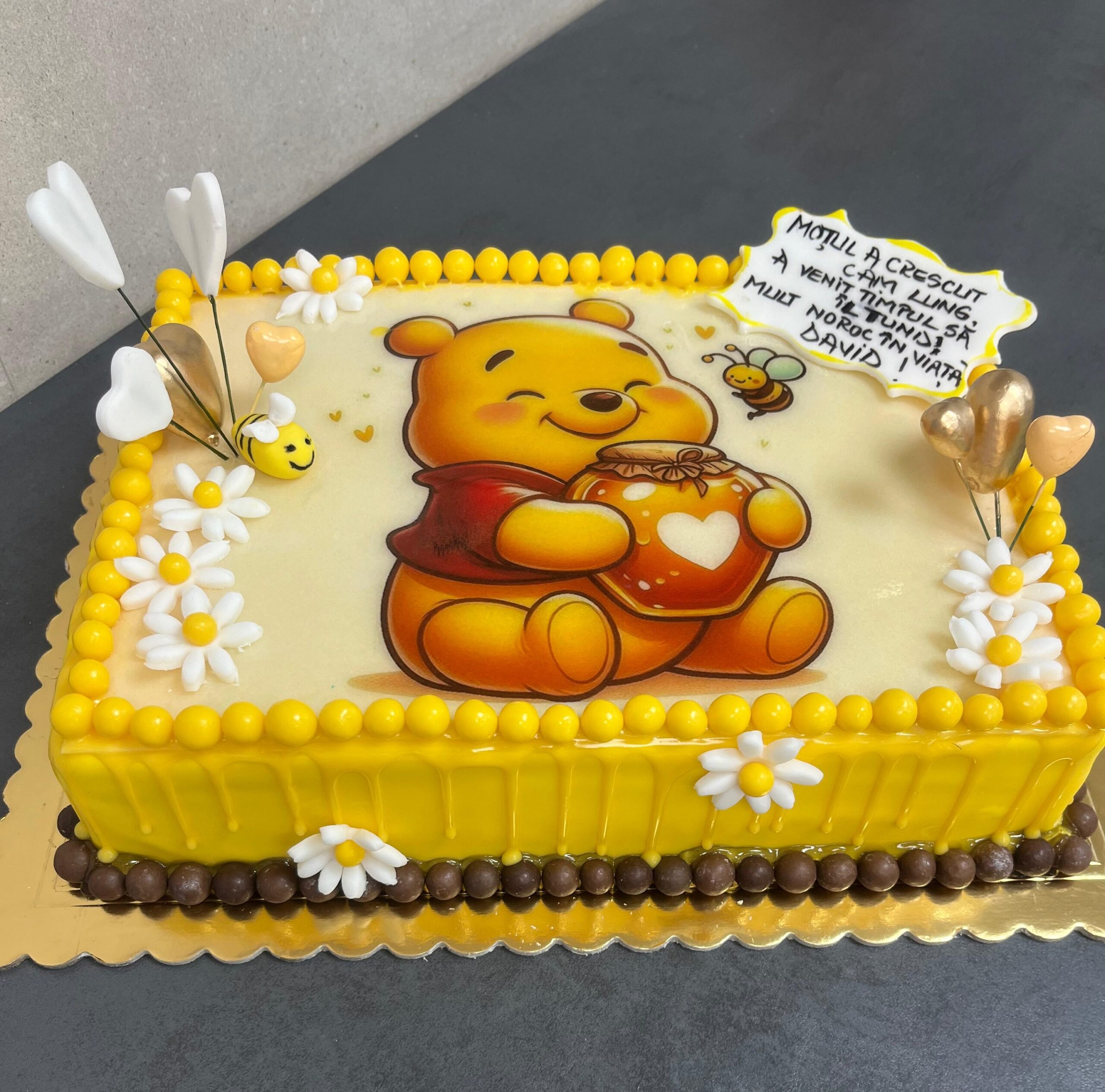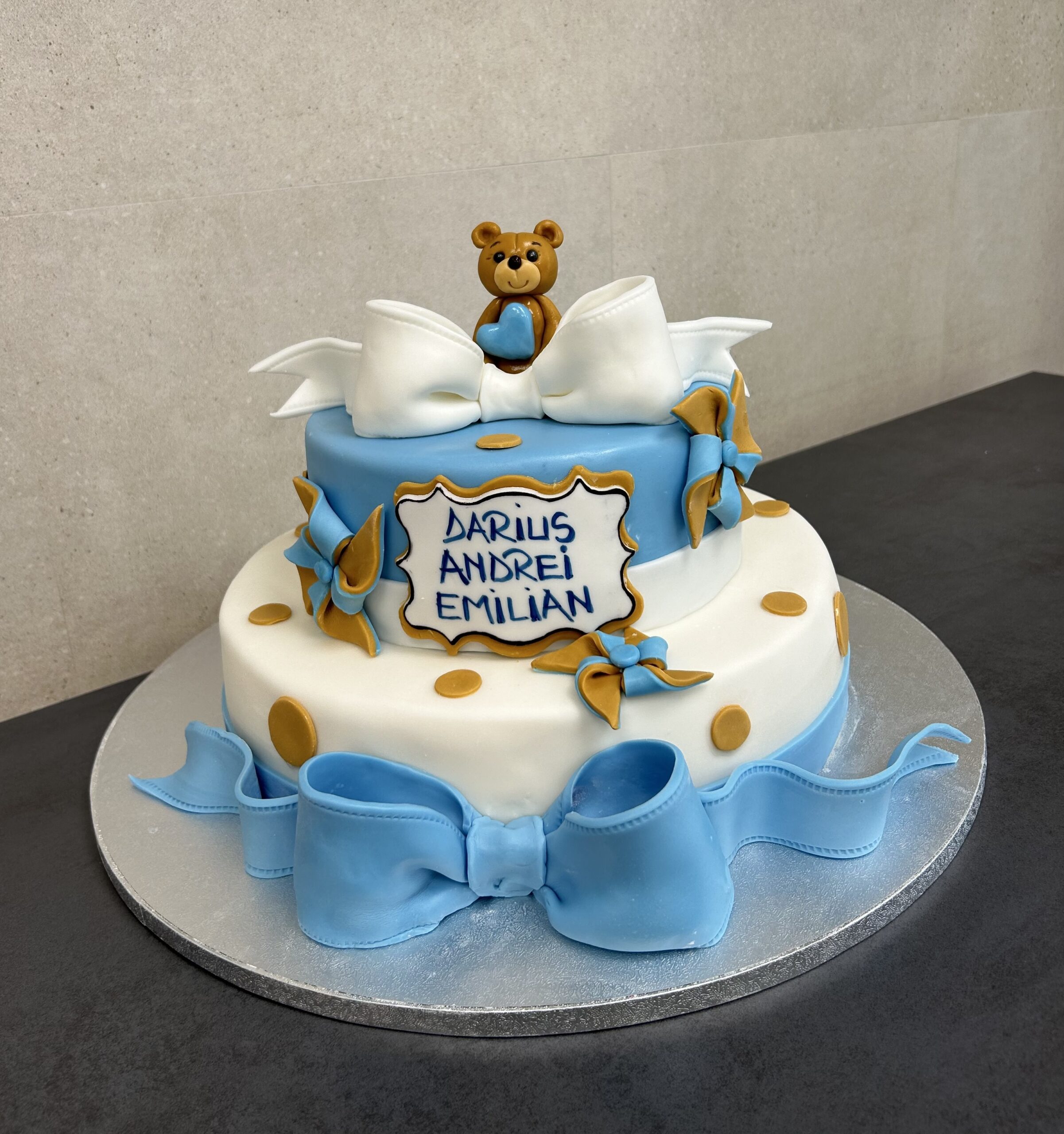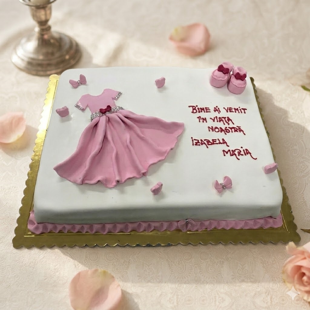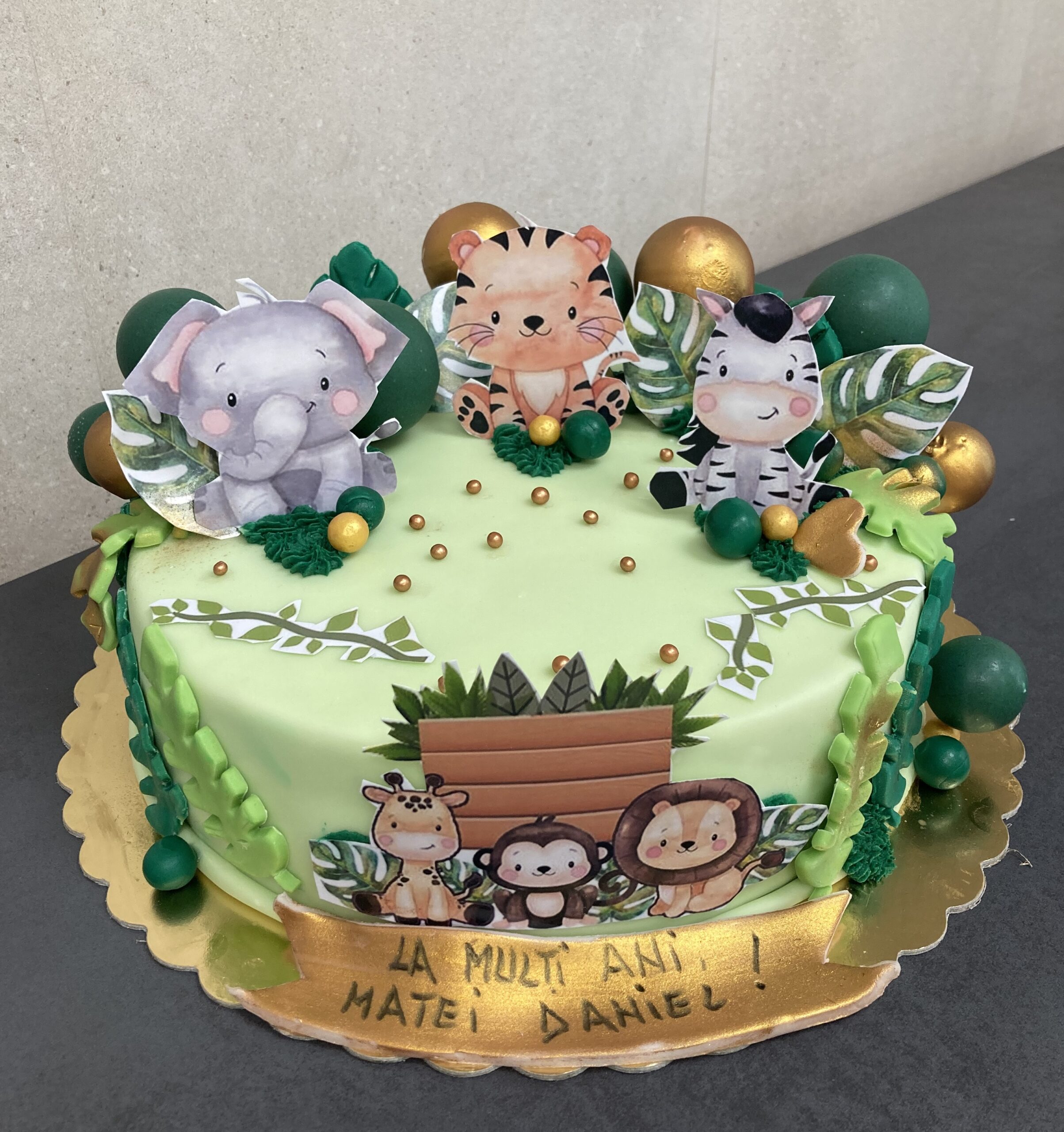 imbracat in crema de unt; decorul contine si elemente necomestibile; se adauga pretul topper-ului, al figurinei din icing si al imaginii necomestibile
