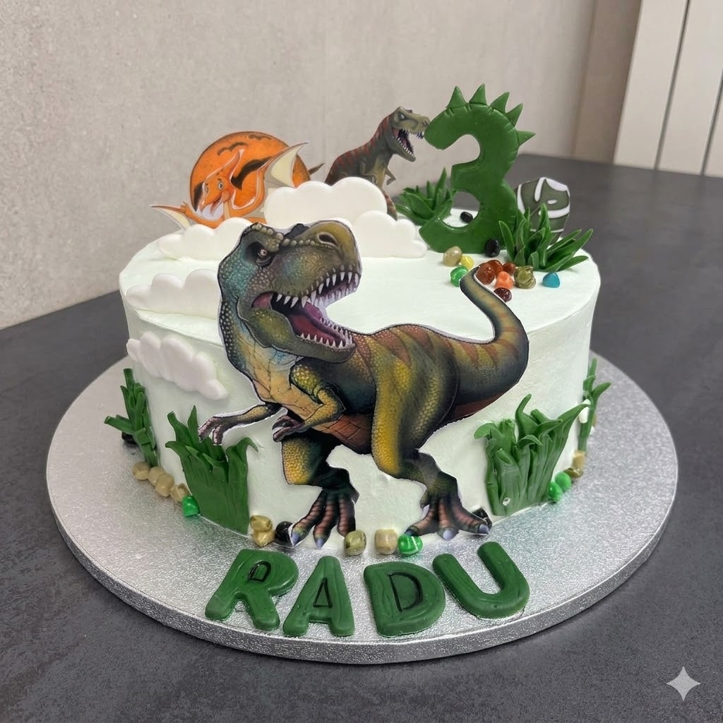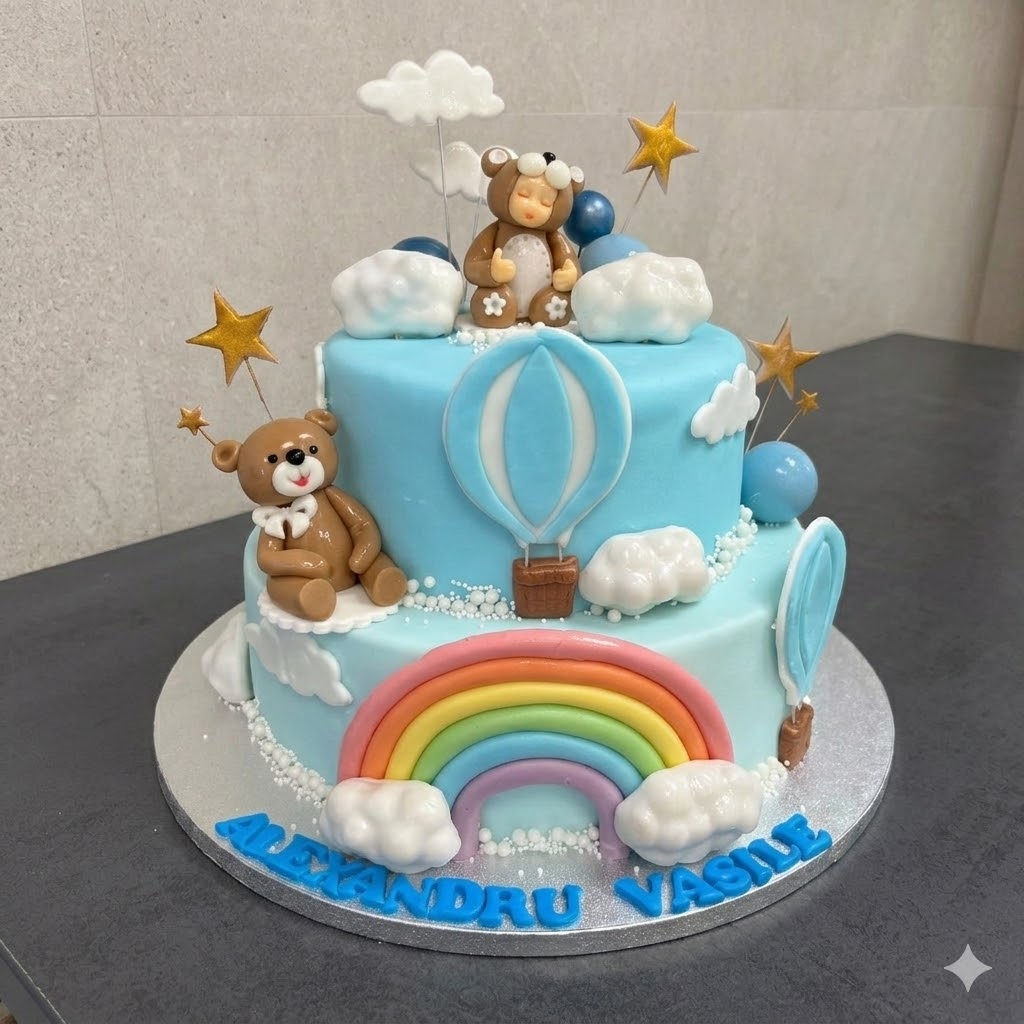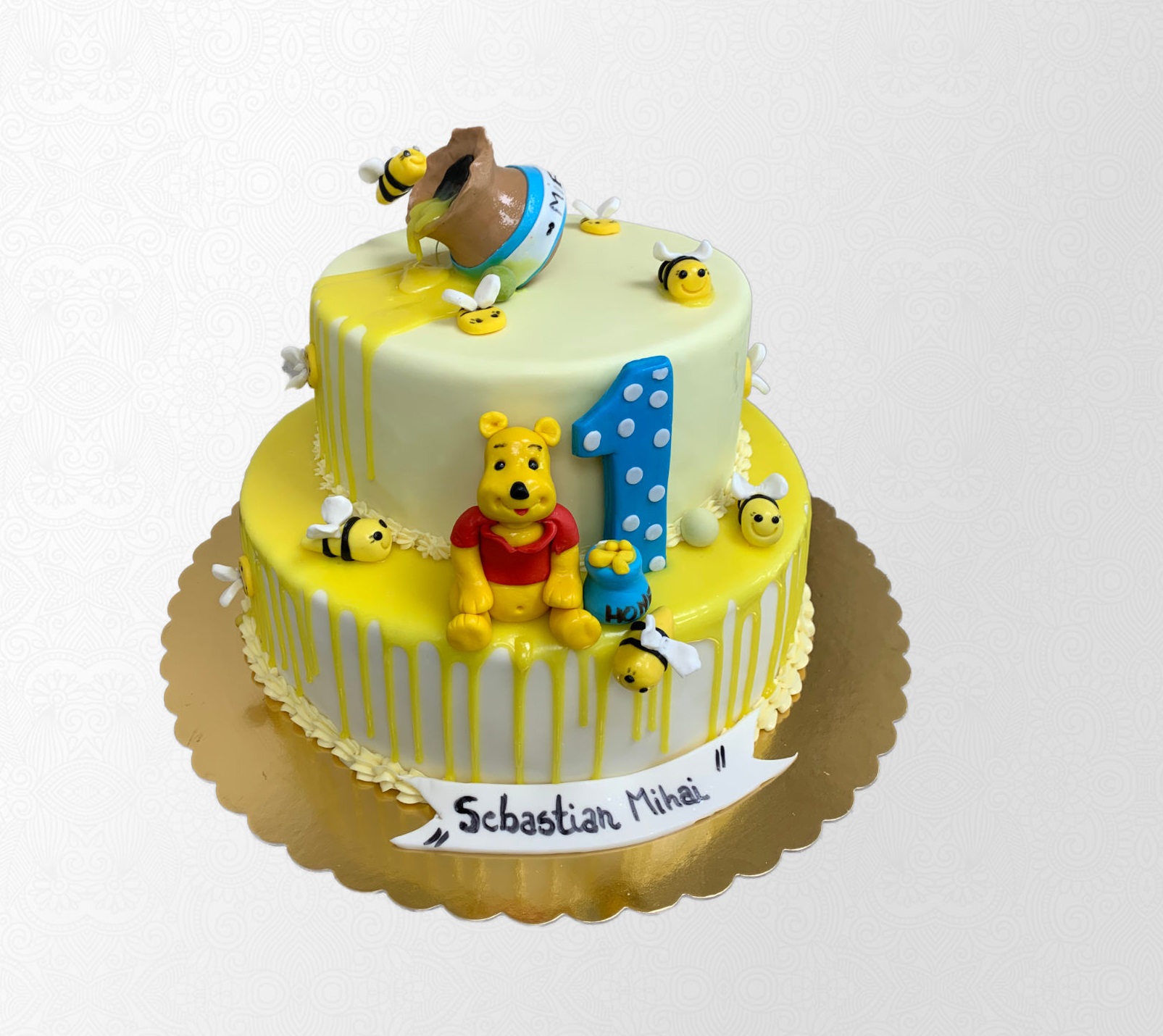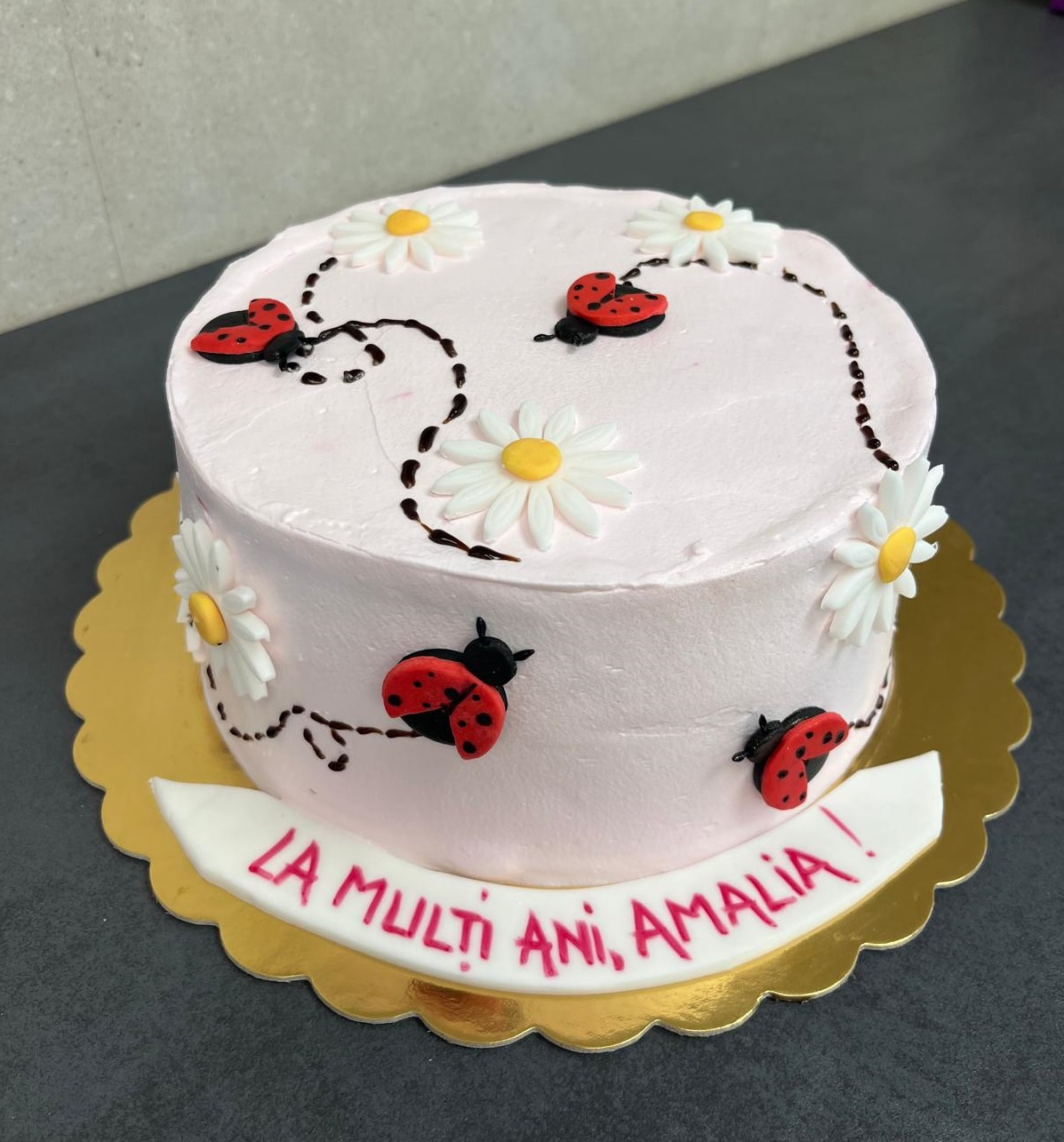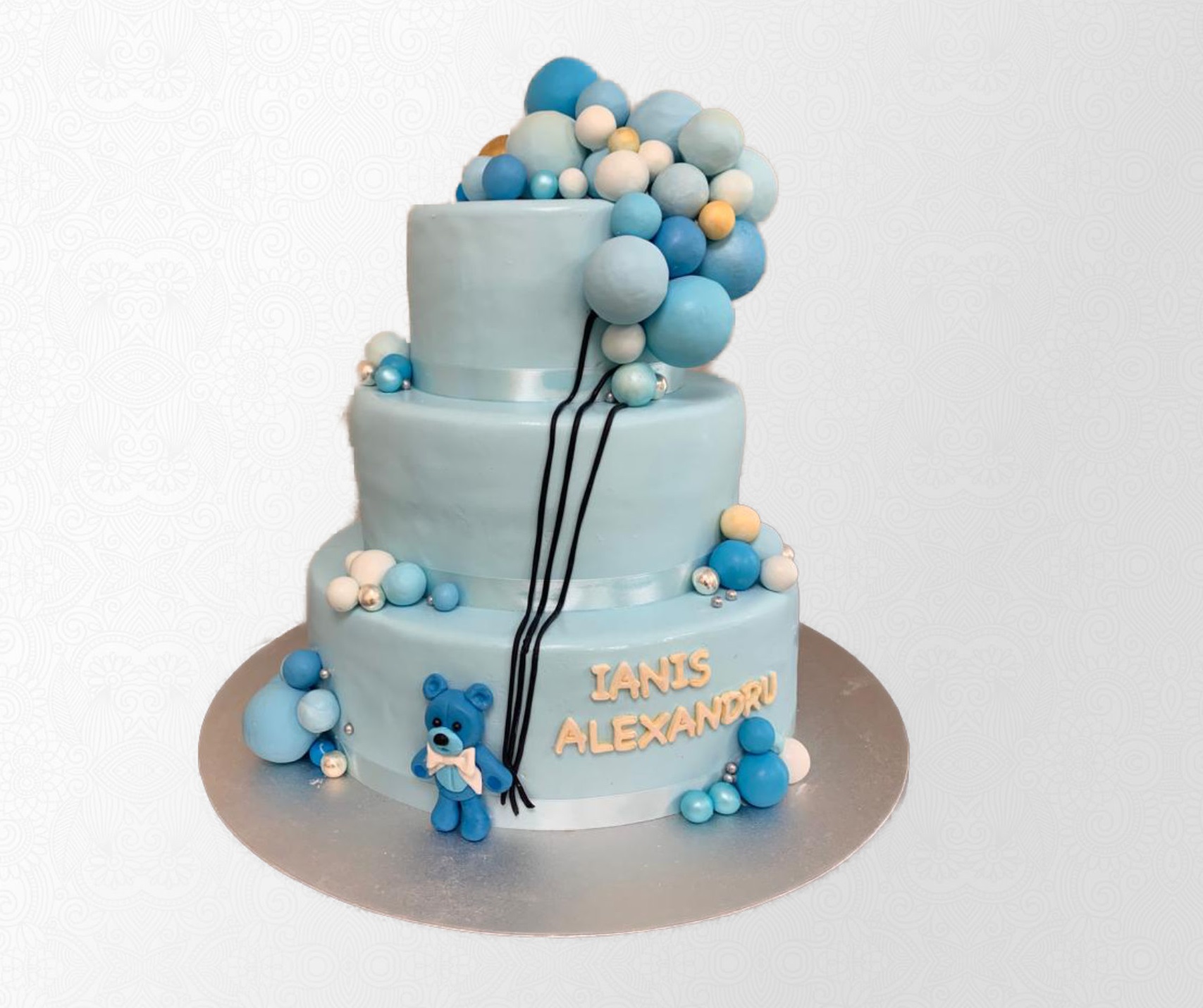 imbracat in crema de unt; decorul contine si elemente necomestibile; se adauga pretul topper-ului, al figurinei din icing si al imaginii necomestibile