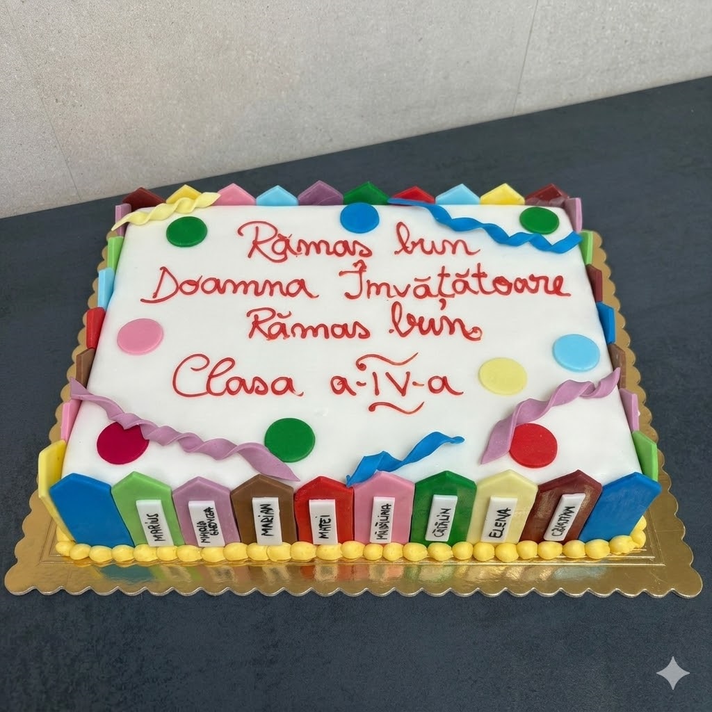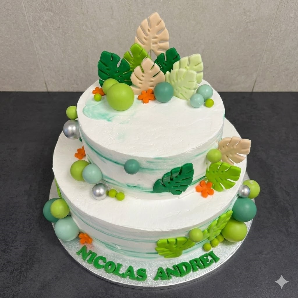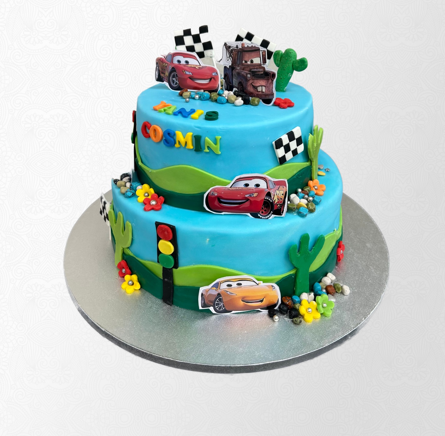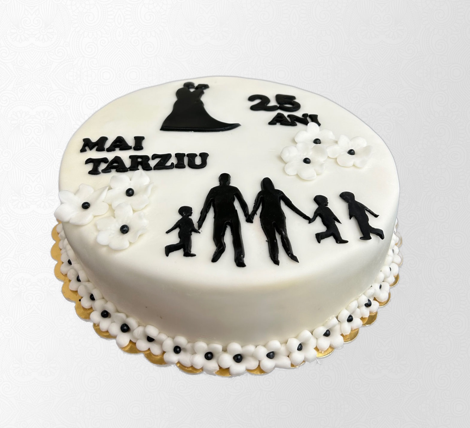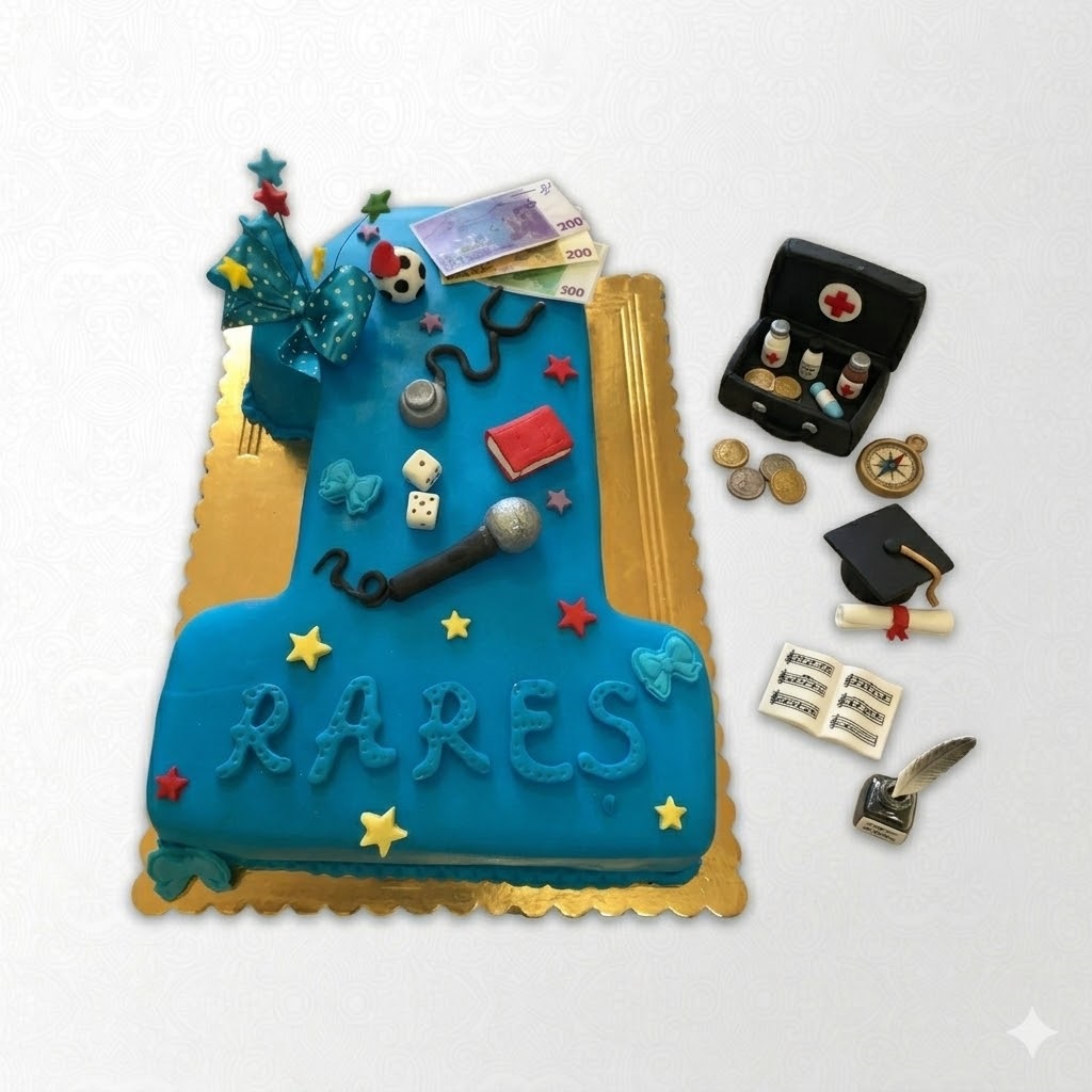imbracat in crema de unt; decorul contine si elemente necomestibile; se adauga pretul topper-ului, al figurinei din icing si al imaginii necomestibile