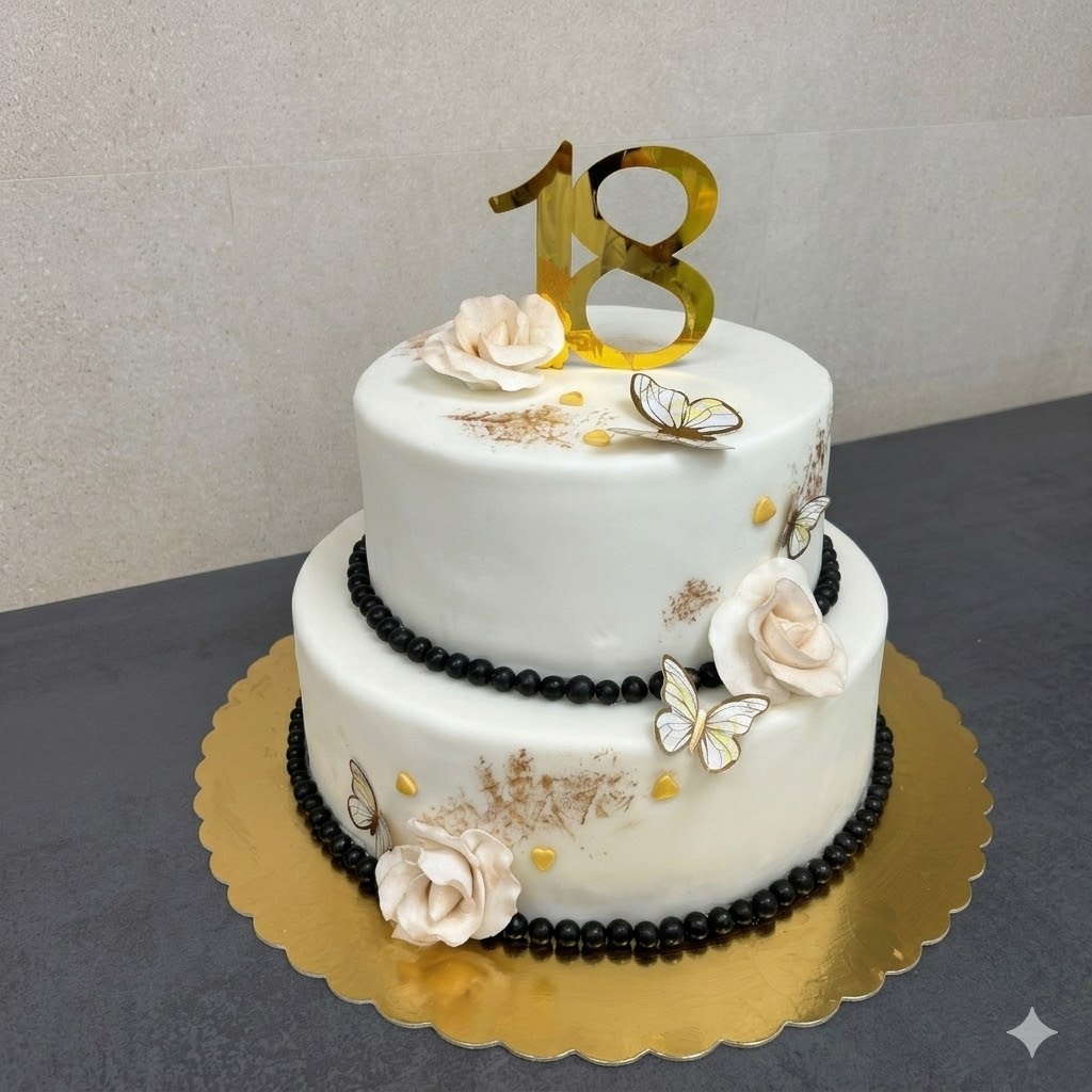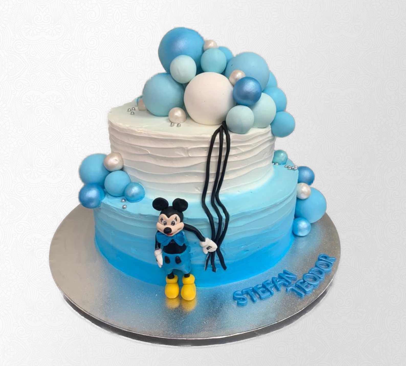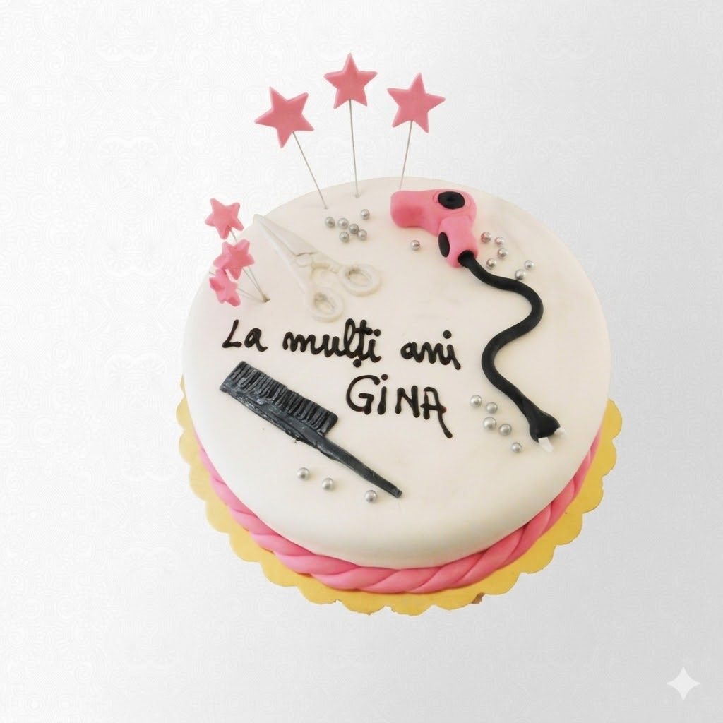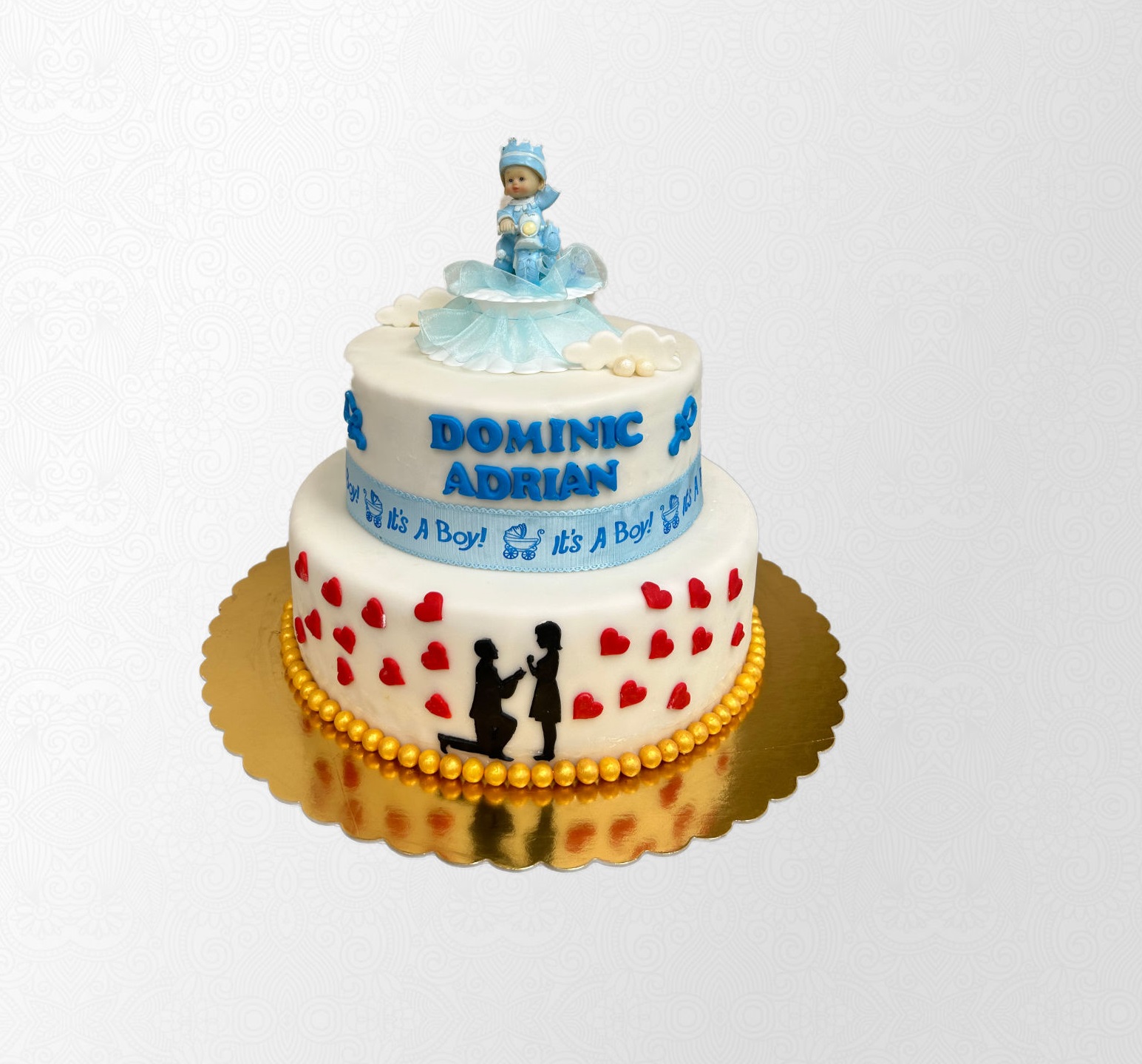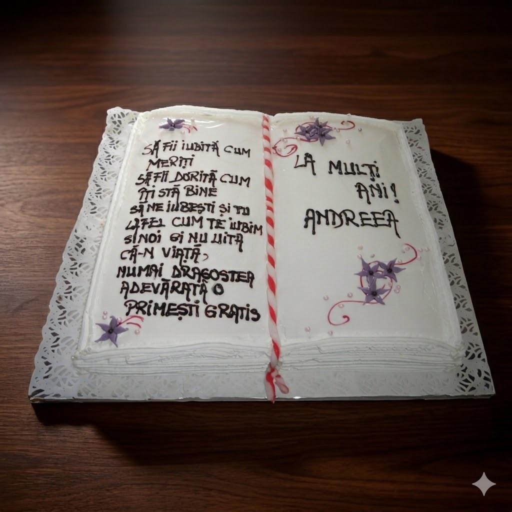 imbracat in crema de unt; decorul contine si elemente necomestibile; se adauga pretul topper-ului, al figurinei din icing si al imaginii necomestibile