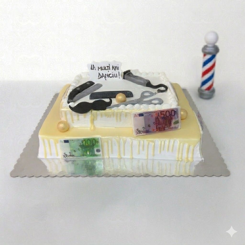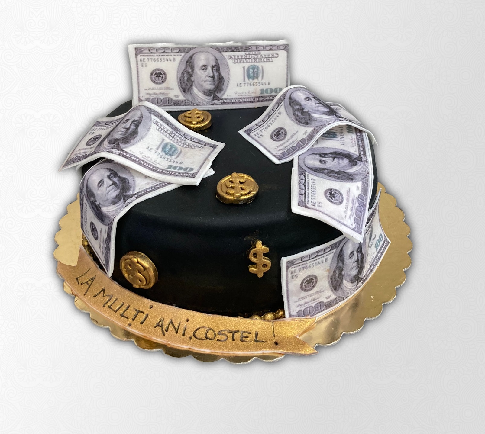 imbracat in icing (pasta de zahar); decorul contine si elemente necomestibile; se adauga 120 lei decorul si pretul bancnotei din vafa comestibila
