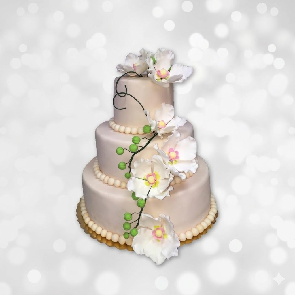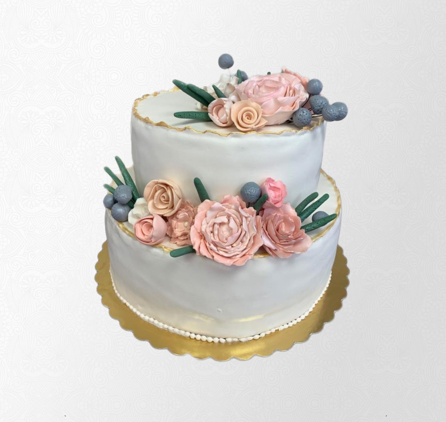 imbracat in icing (pasta de zahar); florile sunt realizate manual din pasta de zahar; decorul contine si elemente necomestibile